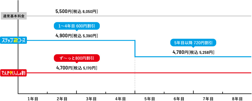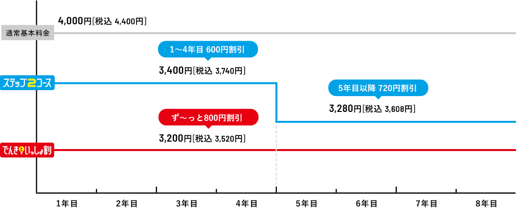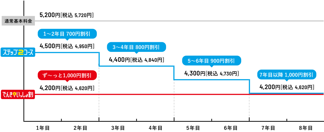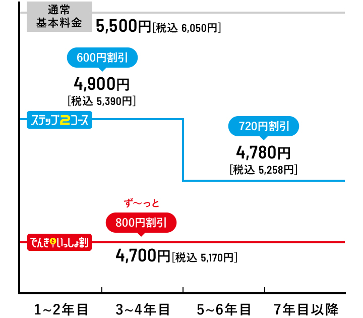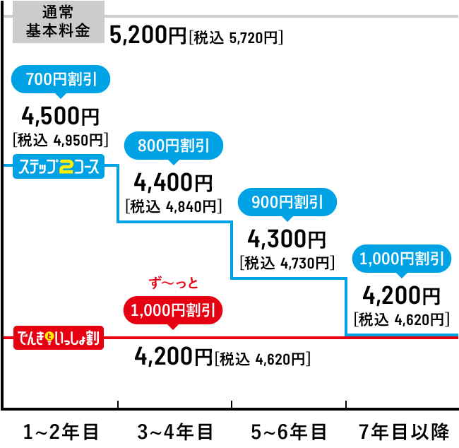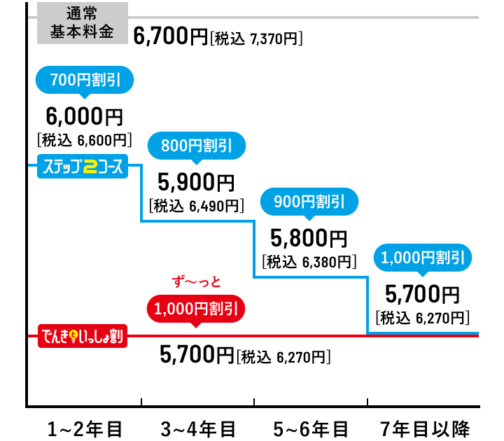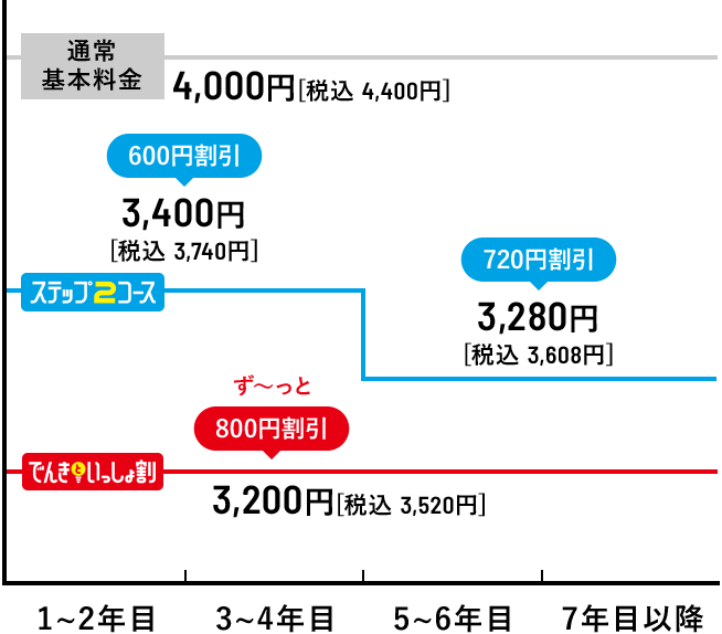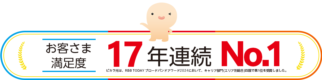 ●「ピカラ光ねっと(1Gプラン・10Gプラン)」の最低利用期間は2年間です。最低利用期間満了前に解約される場合は、「ピカラ光ねっと(1Gプラン・10Gプラン)」解約金(解約月の基本利用料相当額[長期割引やテレビとのセット割等の割引適用後の料金])および契約期間に応じて低減し精算した宅内工事費(配線工事費、回線終端装置工事費)として最大22,000円[税込24,200円]をお支払いいただく場合がございます。●長期割引制度「ステップ2コース」、「でんきといっしょ割コース」の長割適用期間は2年間です。長割適用期間満了前にピカラ光ねっとを解約する場合は、長期割引制度の解約手数料(解約月の基本利用料相当額[長期割引やテレビとのセット割等の割引適用後の料金])をお支払いいただきます。ただし、「ピカラ光ねっと(1Gプラン・10Gプラン)」の最低利用期間満了前に解約される場合は、解約金および契約期間に応じて低減し精算した宅内工事費(配線工事費、回線終端装置工事費)をお支払いいただき、解約手数料のお支払いは不要です。長割適用期間経過後は自動更新となり、2年毎に長割適用期間が設定されます。更新月(24ヶ月目)以降の3ヶ月間の解約は解約手数料不要です。詳しくは下記「契約期間のイメージ」をご確認下さい。●「でんきといっしょ割コース」をご契約いただくには、弊社所定の方法によりお申込みが必要です。●「でんきといっしょ割コース」は、四国電力の「おトクeプラン」「でんかeプラン」「でんかeマンションプラン」または「昼トクeプラン」の契約(以下「対象電気契約」といいます。)およびピカラ光ねっとの契約を、お客さまが同一使用場所でご契約いただく場合に、ご加入いただけます。●四国電力の対象電気契約1契約につき、「でんきといっしょ割コース」1契約の適用といたします。複数のピカラ光ねっと契約がある場合でも、割引対象契約は1契約といたします。●解約日にかかわらず解約月の月額料金(オプション含む)は日割りとなりません。●本サービス解約時には、別途、撤去費用がかかる場合があります。●通信速度最大1Gbps・通信速度最大概ね10Gbpsとはベストエフォート型のサービスであり、一定の通信速度を保証するものではありません。●インターネットご利用時の速度は、お客さまのご利用環境(パソコンの処理能力、ハブやルーターなどのご利用機器の機能・処理能力、LANケーブルの規格、電波の影響等)や回線の混雑状況によって低下する場合もあります。 ●「ピカラ光ねっと(1Gプラン・10Gプラン)」は、お客さまに安定した高品質のサービスをご提供するために、一定水準を超えるデータ送信を行っているお客さまに対して、利用制限を行う「通信制限」を実施いたします。通信制限の内容は、直近3日間のデータ送信(アップロード)通信量の合計が600GB(ギガバイト)を超過したお客さまに対して、一定期間、一定水準の通信速度に絞ります。●本契約は初期契約解除制度の対象です。ご契約内容確認書面「申込受付のお知らせ」を受領した日から起算して8日を経過するまでの間、書面により本契約の解除を行うことができます。