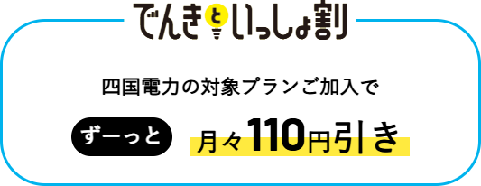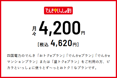 ●「でんきといっしょ割」のご契約は、四国電力のでんき「おトクeプラン」「でんかeプラン」「でんかeマンションプラン」または「昼トクeプラン」の契約(以下「対象電気契約」といいます。)およびピカラモバイルにご加入のお客さまが対象で、対象電気契約とピカラモバイル契約が同一住所に限ります。四国電力の対象電気契約1契約につき、5回線まで適用となります。なお、Webお申込み、ピカラモバイルMyページよりご登録の場合、供給地点番号の入力が必要となります。