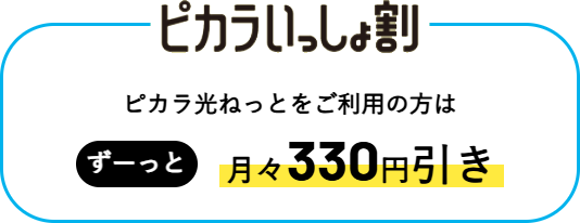 ●「ピカラいっしょ割」のご契約は、ピカラ光ねっと(まるごとピカラ、お仕事ピカラは対象外)のご契約およびピカラモバイルにご加入のお客さまが対象で、両サービスの契約者住所が同一に限ります。ピカラ光ねっと1契約につき、1回線まで適用となります。また、ご利用開始は申込月の翌月、または翌々月から適用となります。
